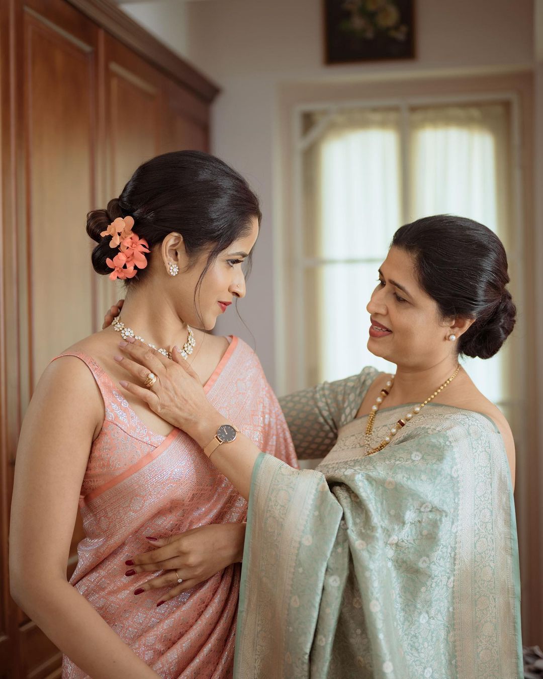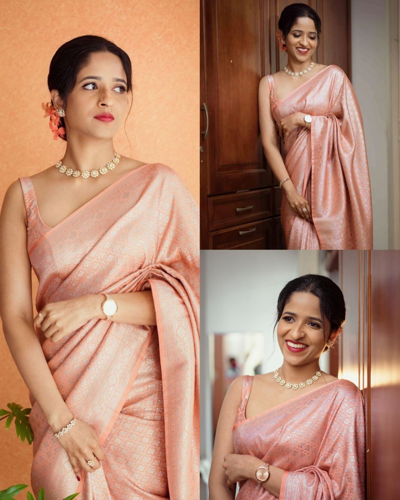 Step into elegance with this peach Lichi silk rich pallu jacquard work party wear saree, designed to make you shine at any event. Crafted from luxurious soft Lichi silk, this saree features a stunning rich pallu and intricate jacquard work all over, offering a perfect blend of sophistication and style. The exclusive jacquard border blouse adds a refined touch, making this saree an ideal choice for parties, weddings, and festive celebrations.