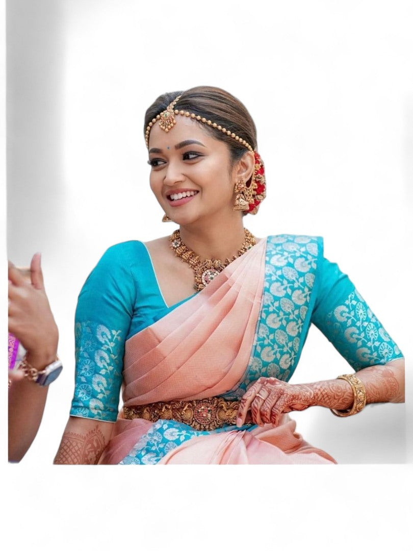 Elevate your bridal ensemble with our Peach Lichi Silk Wedding Saree. Made from soft lichi silk cloth, this saree boasts a beautiful rich pallu and intricate jacquard work adorning the entire saree. The exclusive color contrast jacquard border blouse adds a contemporary flair to the traditional attire. Perfect for weddings and special occasions, this saree will make you radiate elegance and grace. Complete your bridal look with this exquisite piece and leave a lasting impression on everyone. Order now and make your wedding day truly memorable.