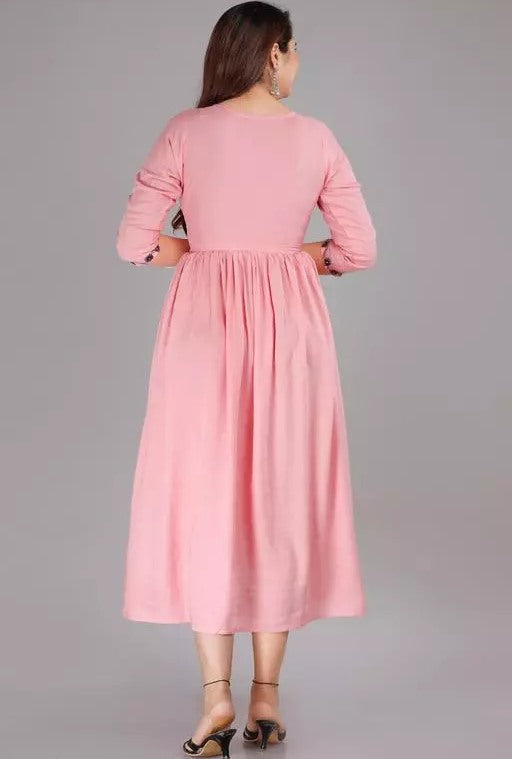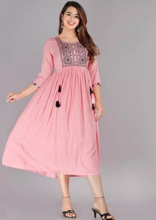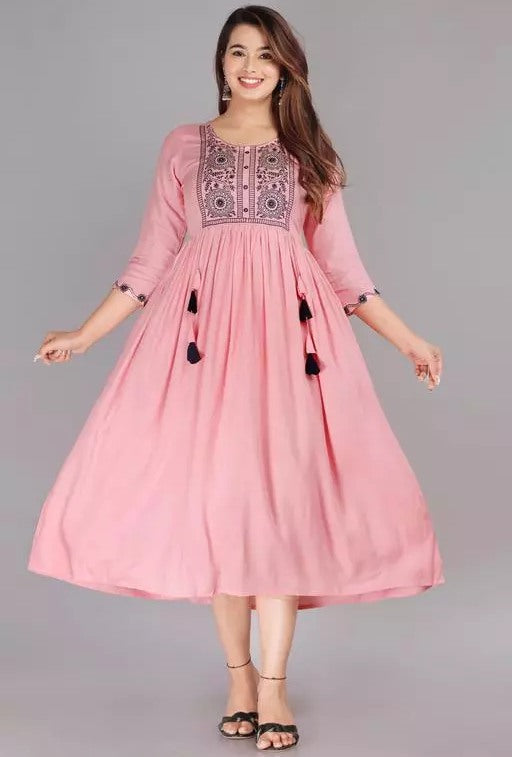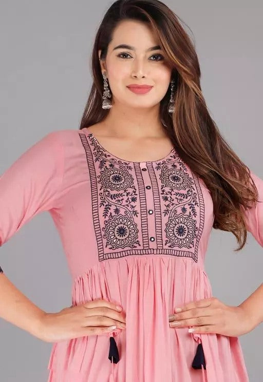 Peach rayon embroidered frock kurti