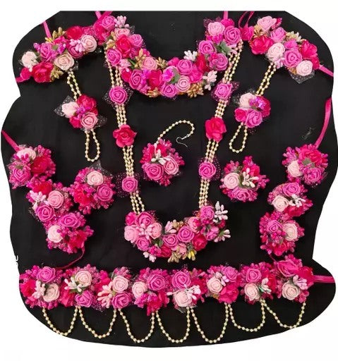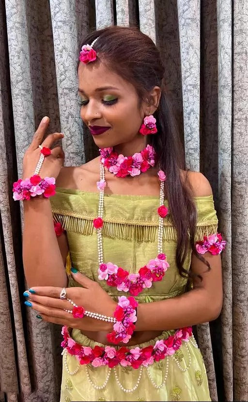 Pink artificial flower and pearls jewellery set for baby shower haldi mehendi -