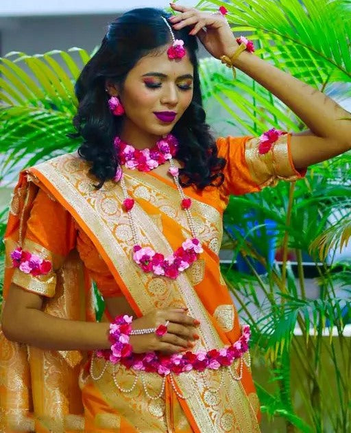 Mehendi & Sangeet haldi is the perfect occasion to celebrate fun and peppiness in the ways one dress up and accessories with floral jewellery.
