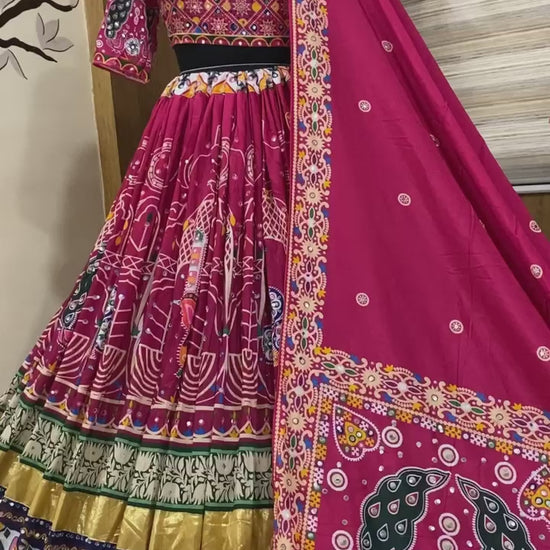 Embrace the festive vibe of Navratri with this elegant Pink Cotton Mirror Work Chaniya Choli. Perfect for Garba nights and traditional celebrations, this outfit is a beautiful fusion of vibrant digital prints and intricate mirror work, designed to make you stand out.