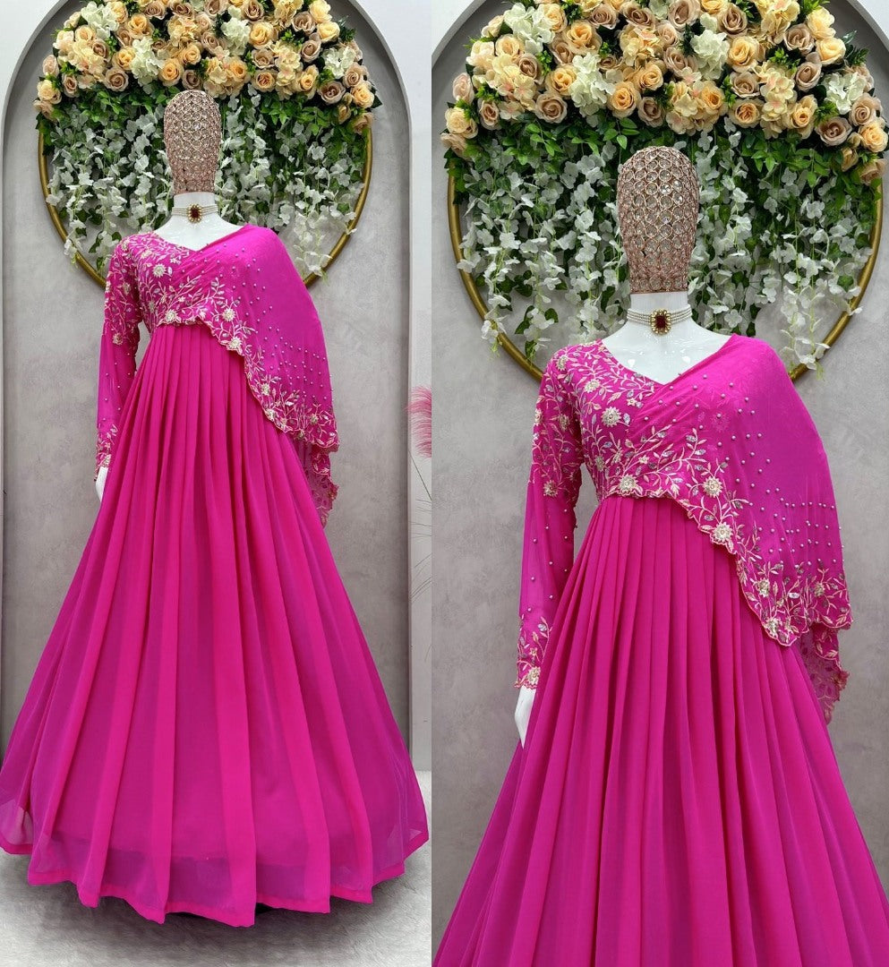 Pink georgette thread sequence and pearl work ceremonial gown -