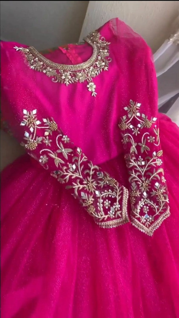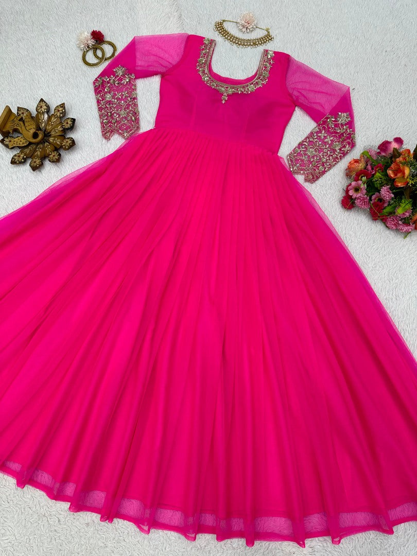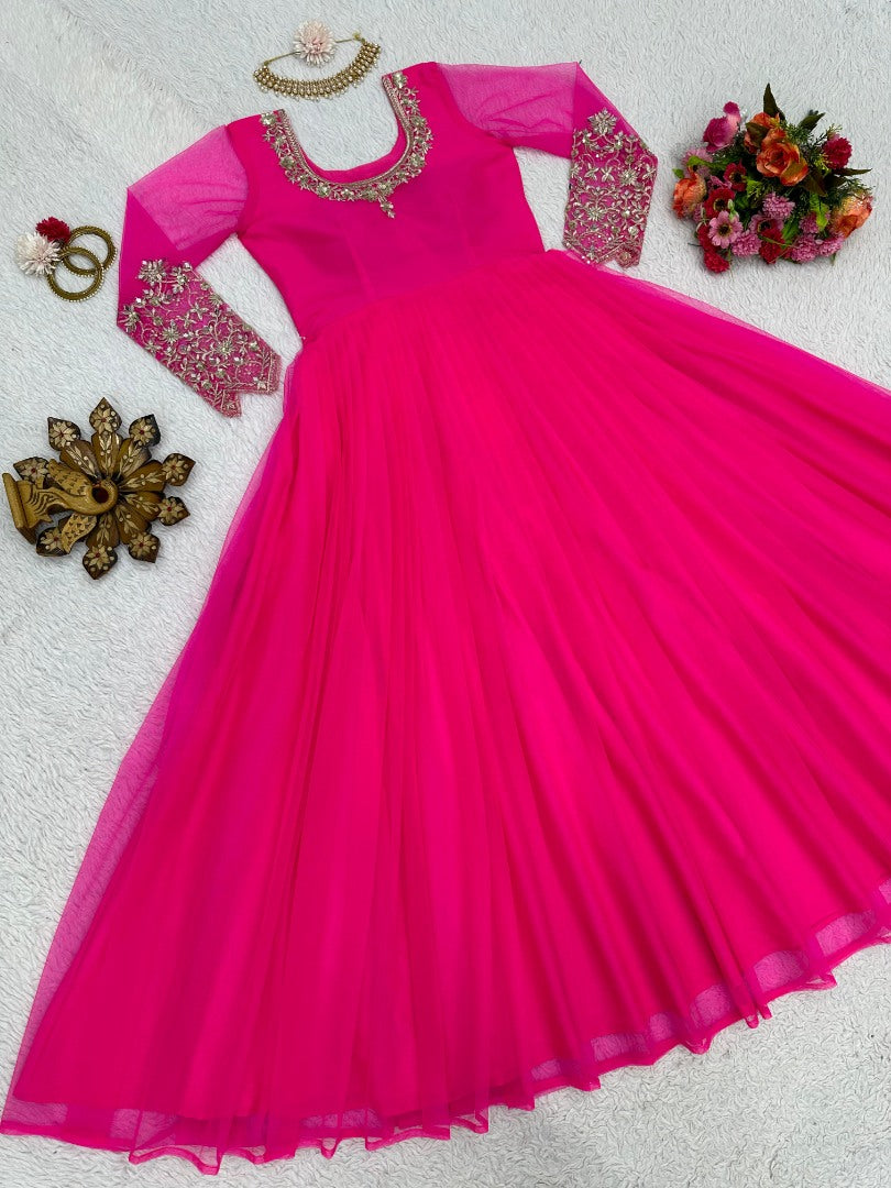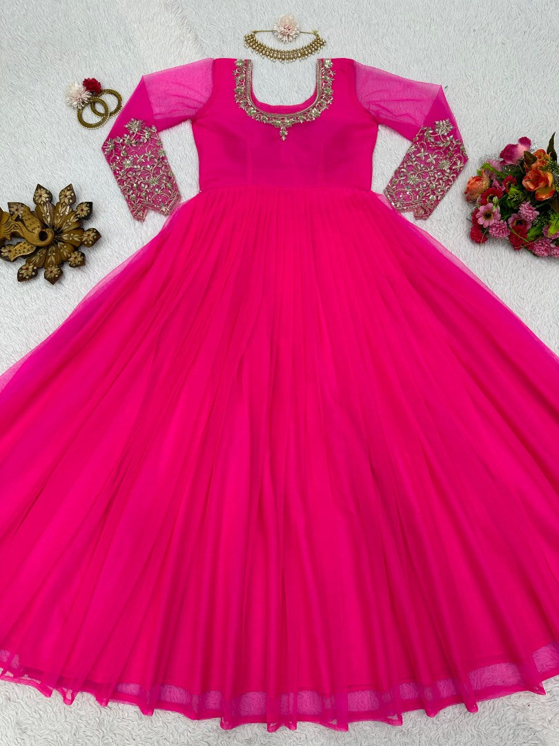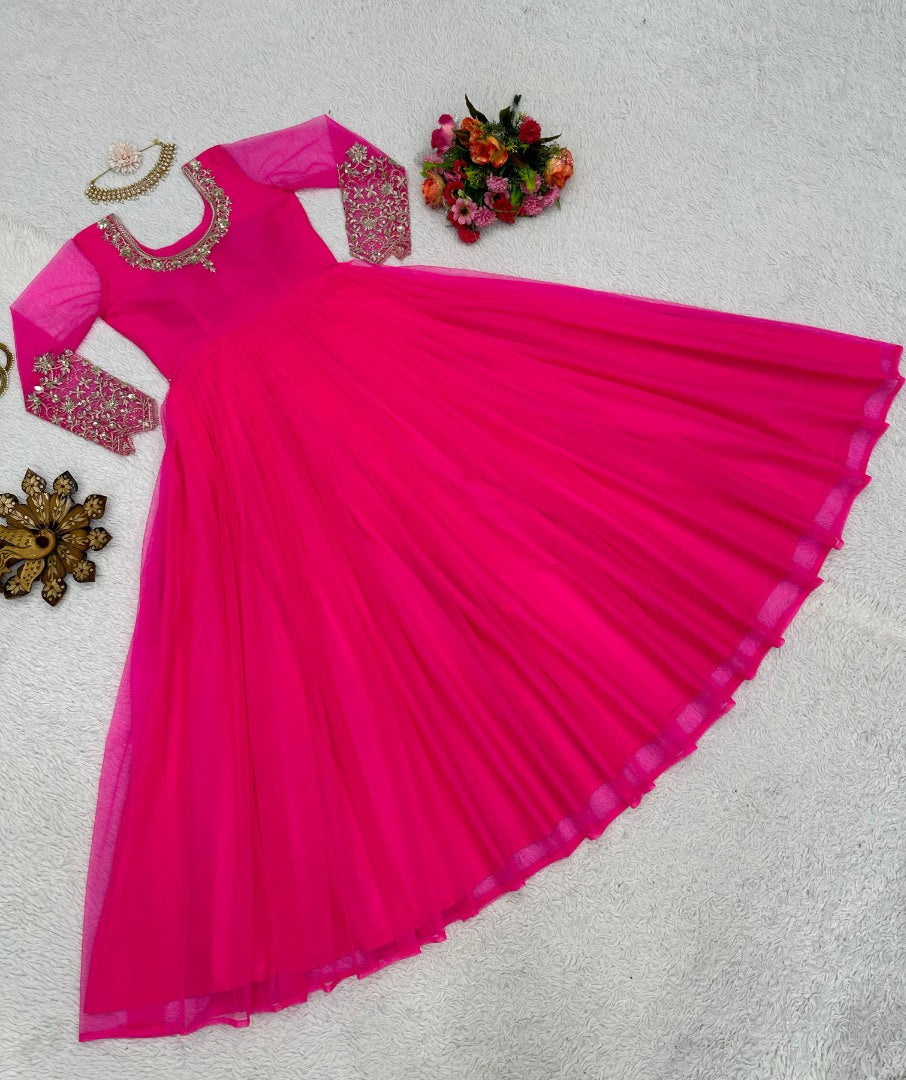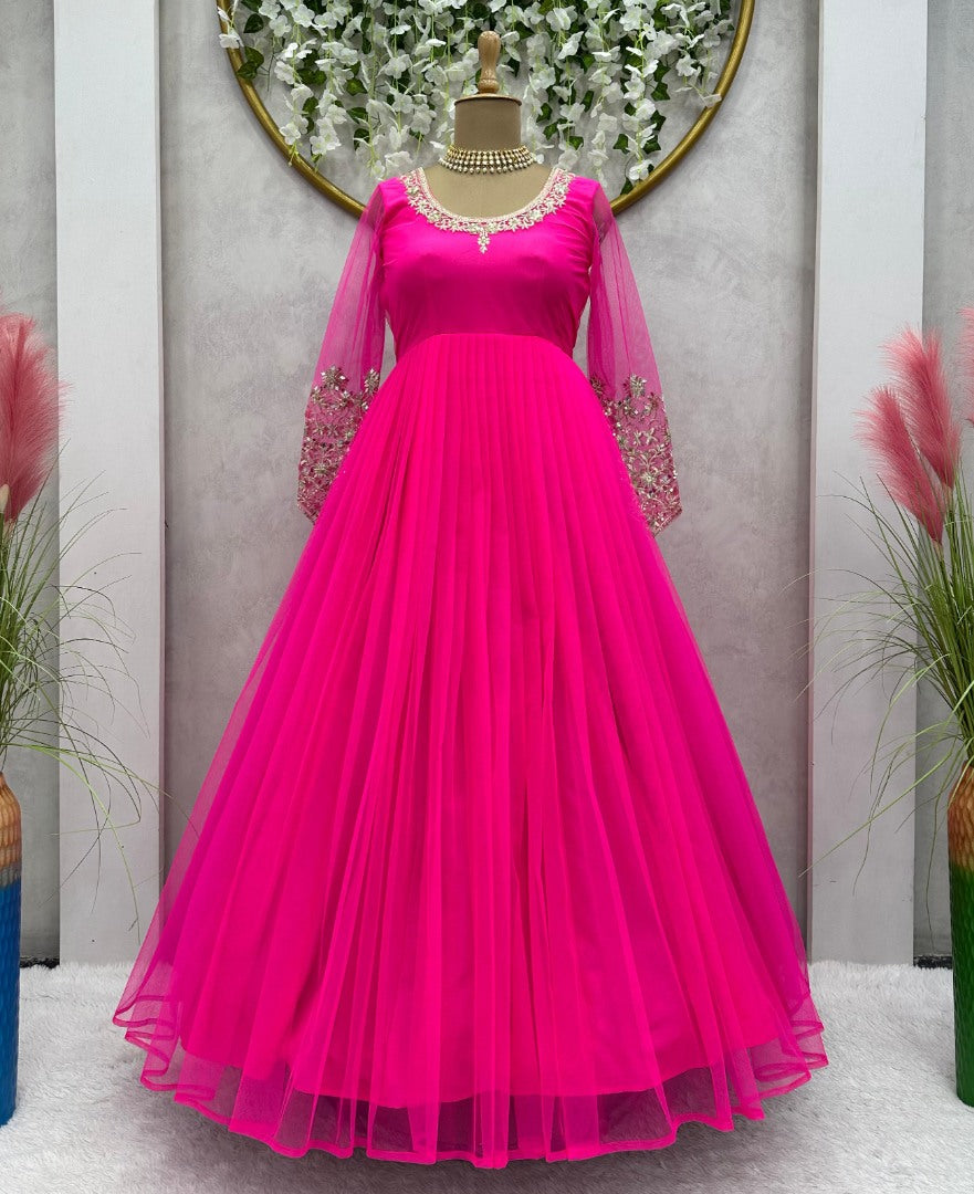 Introducing our Pink Soft Net Thread Sequence Work Evening Gown, a glamorous and elegant addition to your wardrobe that will leave you feeling like a true fashionista. Crafted with exquisite attention to detail, this gown is designed to make you stand out on any special occasion.