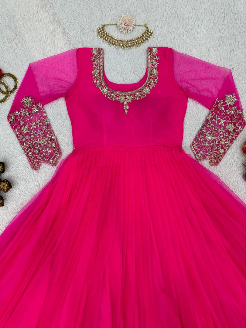This Pink Soft Net Thread Sequence Work Evening Gown is a masterpiece of design and craftsmanship, perfect for weddings, galas, cocktail parties, or any occasion where you want to make a stunning impression. Don't miss the opportunity to own this timeless piece. Elevate your style and confidence with our exquisite evening gown. Order yours today and prepare to shine!