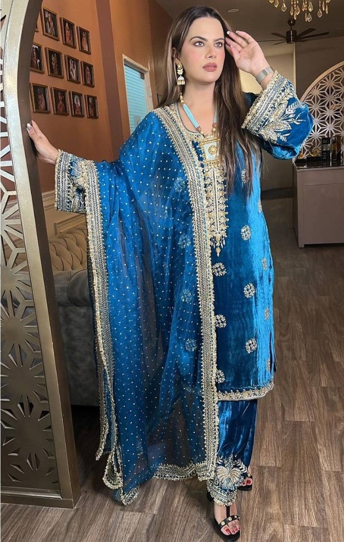 Introducing our luxurious rama velvet embroidery work palazzo suit