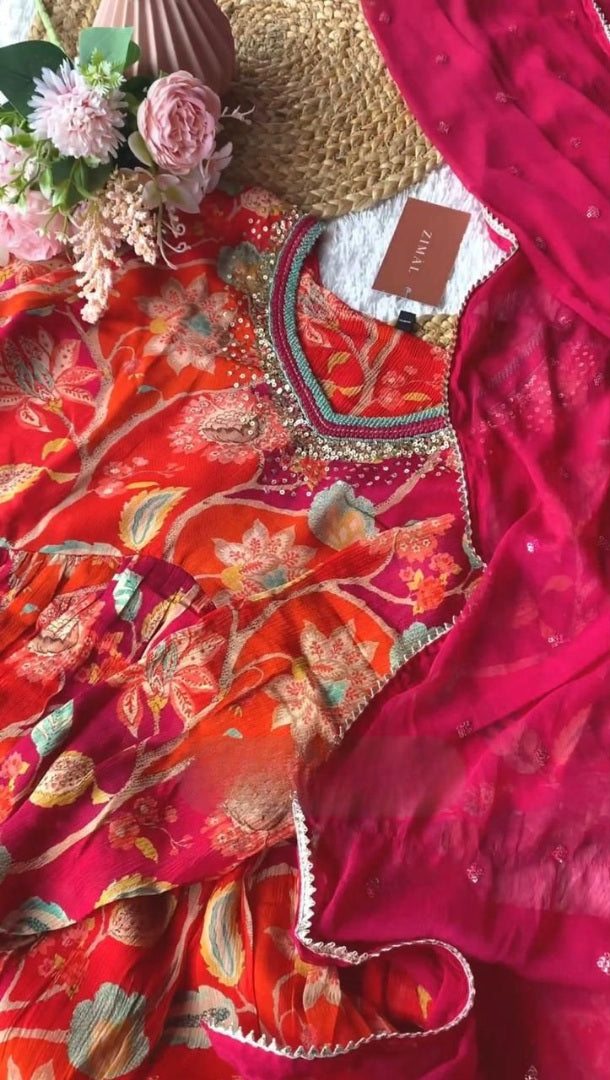Red floral printed thread sequence work designer alia cut kurti