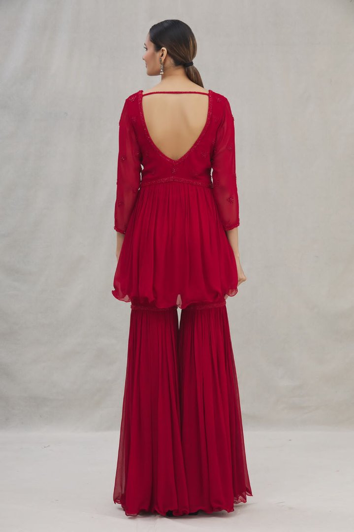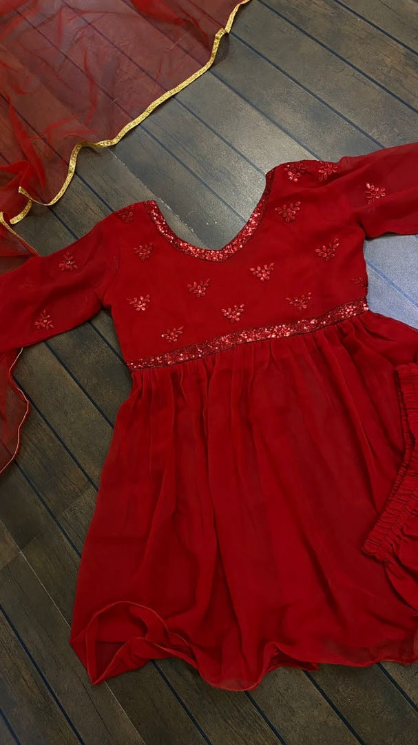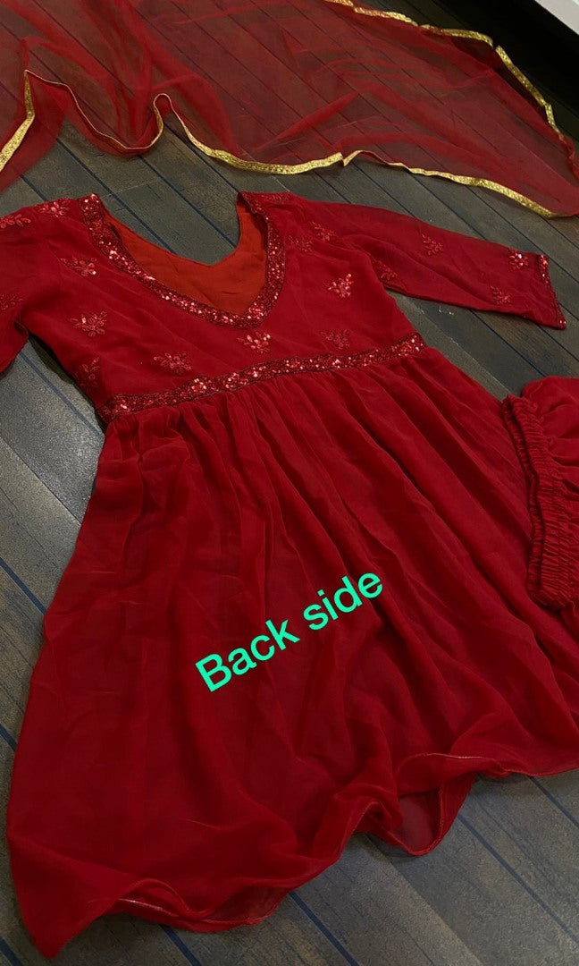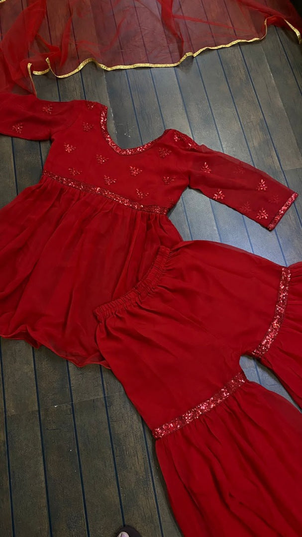 Red georgette thread embroidered sharara salwar suit