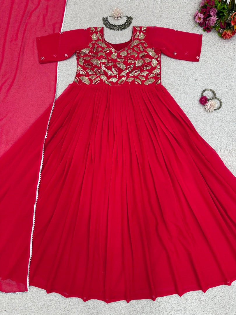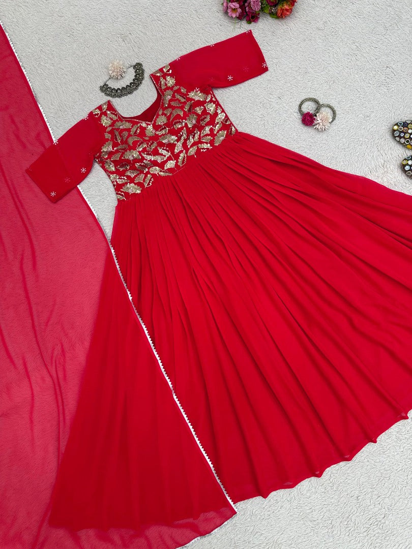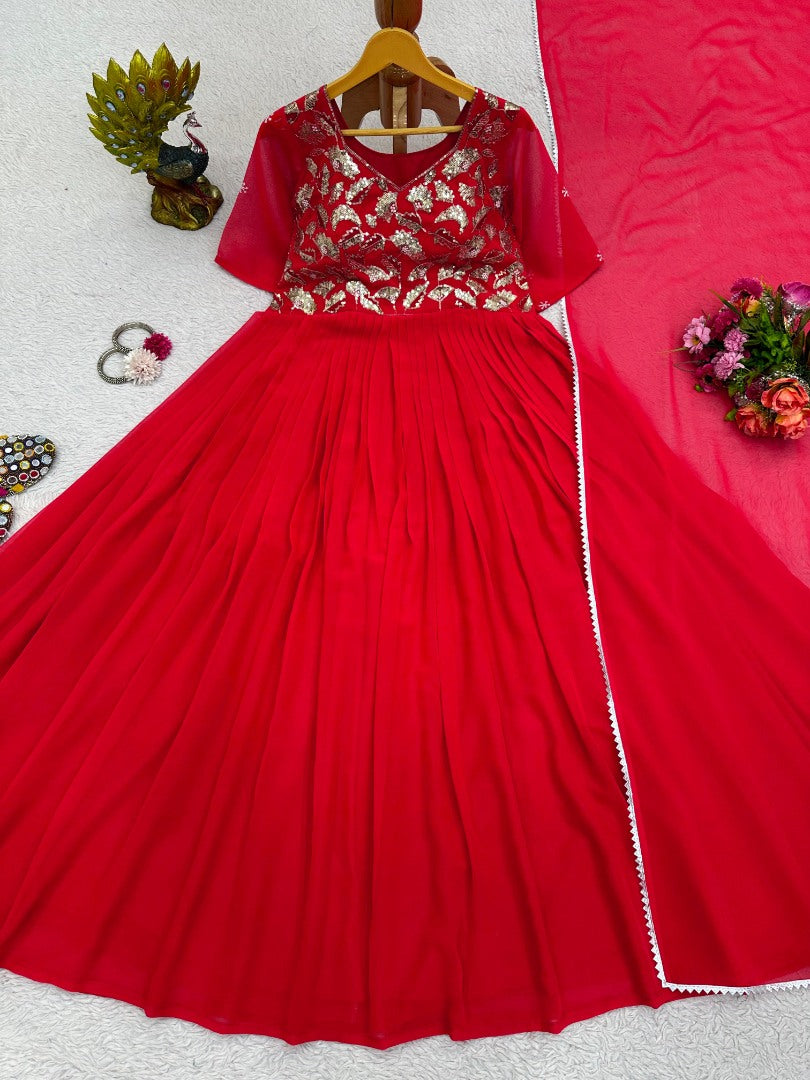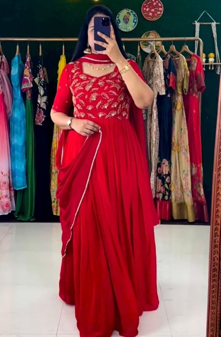 Turn heads at your next event with this elegant Red Georgette Thread Work Anarkali Suit. Perfect for weddings, festive occasions, and special gatherings, this suit blends classic charm with modern style, ensuring you shine with grace.