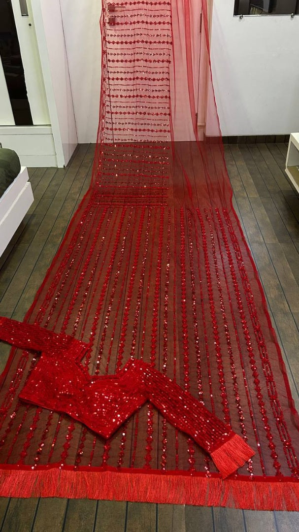 Elevate your bridal elegance with our Red Net Heavy Sequence Thread Work Designer Wedding Saree, a true masterpiece of craftsmanship and style.
