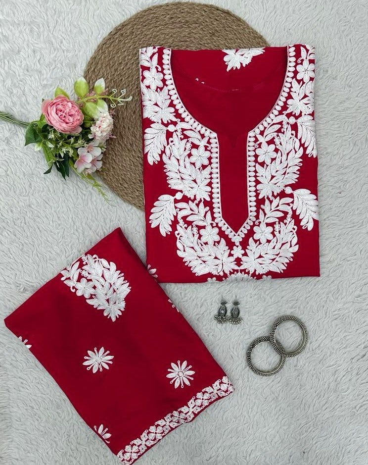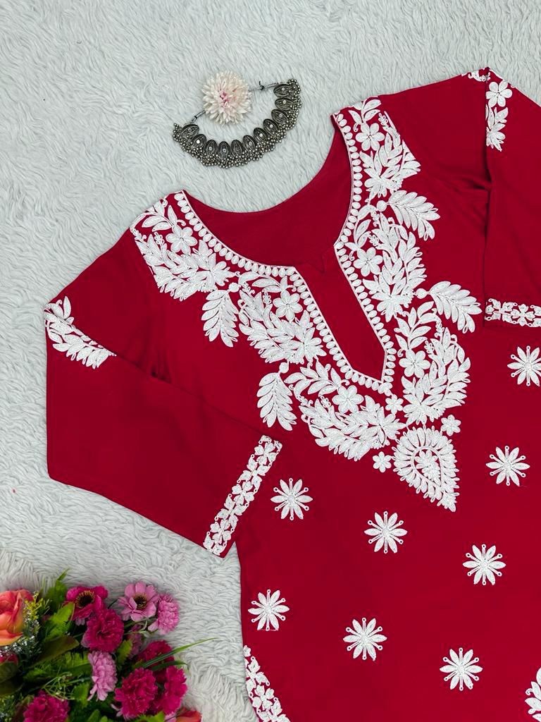 Red rayon chainstitch work palazzo kurti -