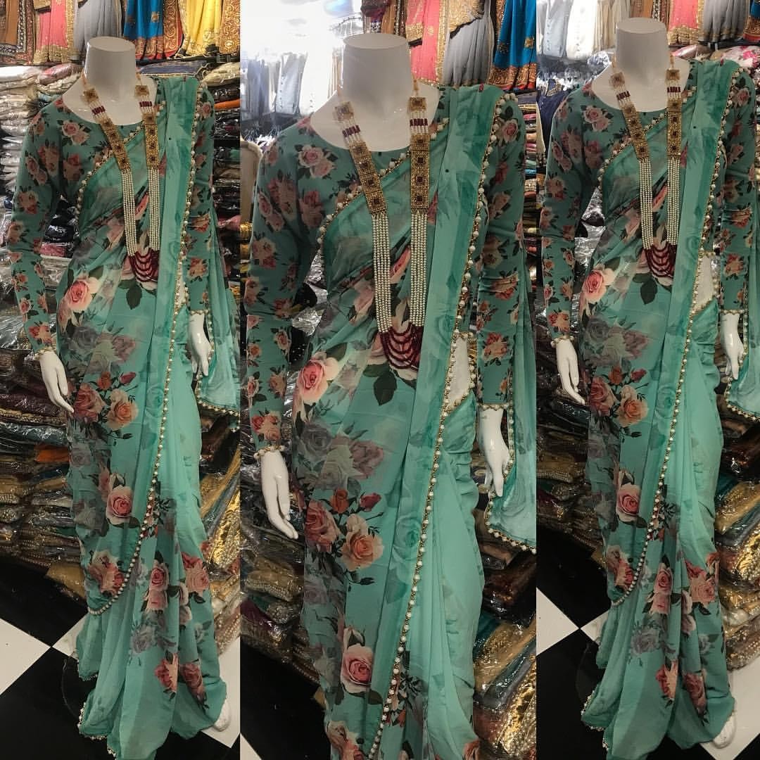 sea green beautiful pure digital 3d printed georgette designer saree with moti lace
