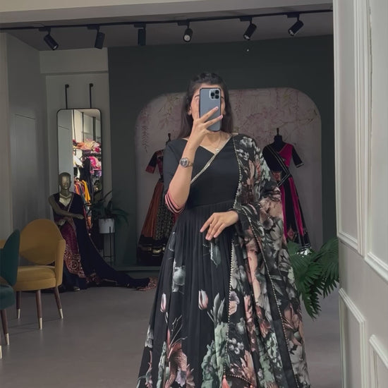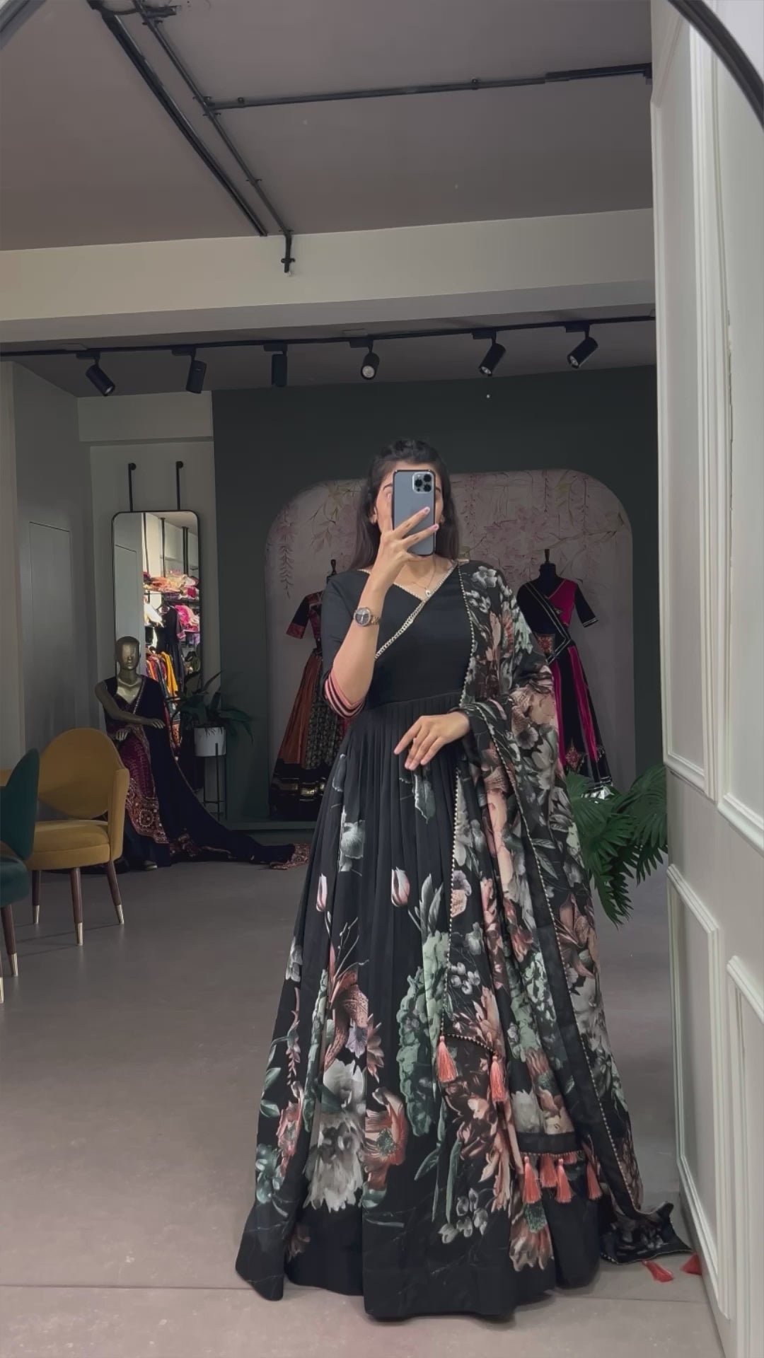 Elevate your style with this stunning Tussar Silk Floral Printed Long Stylish Gown. Perfect for festive occasions, parties, and special events, this gown blends traditional elegance with modern design, ensuring you look effortlessly chic.