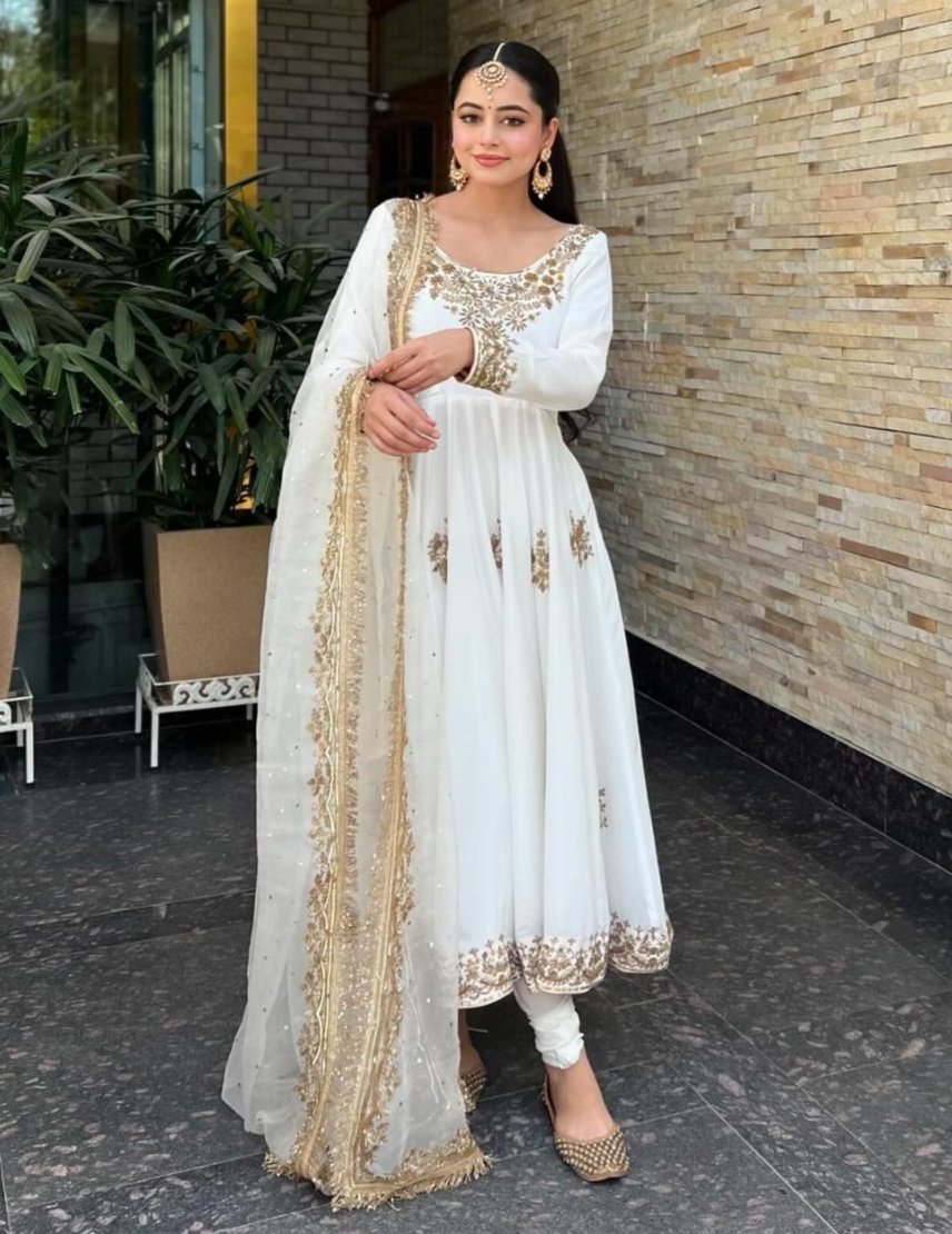 Step into elegance with this stunning White Cotton Embroidered Anarkali Gown. Perfect for weddings, festive occasions, and special events, this Anarkali gown combines traditional embroidery with modern design to ensure you stand out with grace and style.