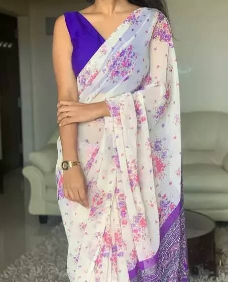 White cotton linen floral printed casual saree -