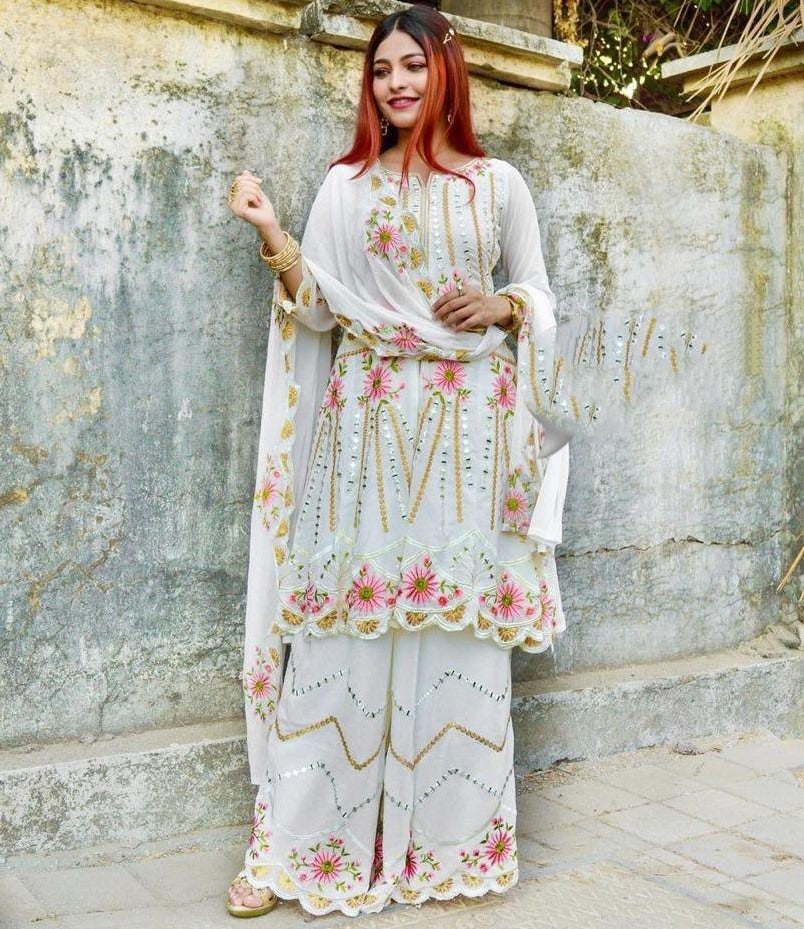 Tags: embroidered, georgette, kurti, Palazzo Suits, plazzo, salwar, sequence, suits, white, with, work