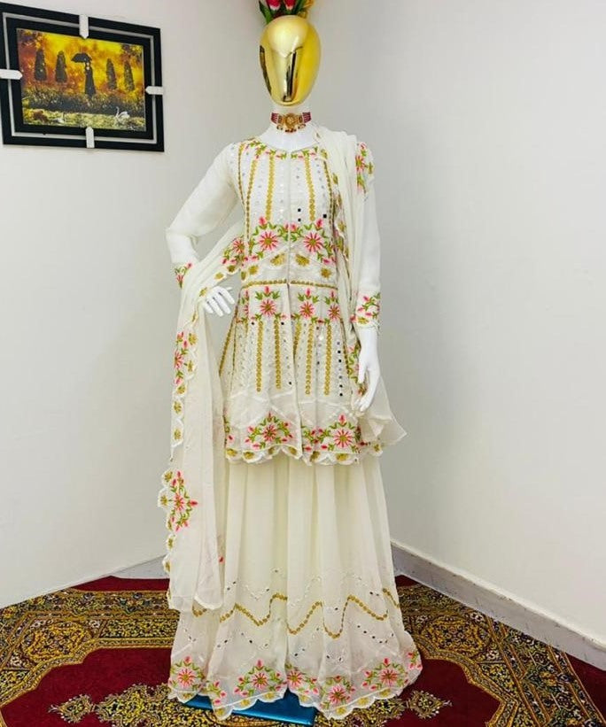 White georgette embroidered sequence work kurti with plazzo