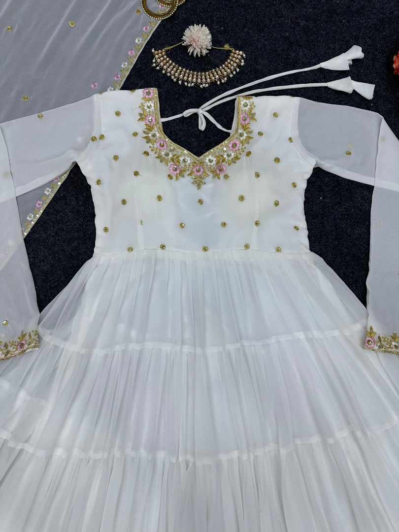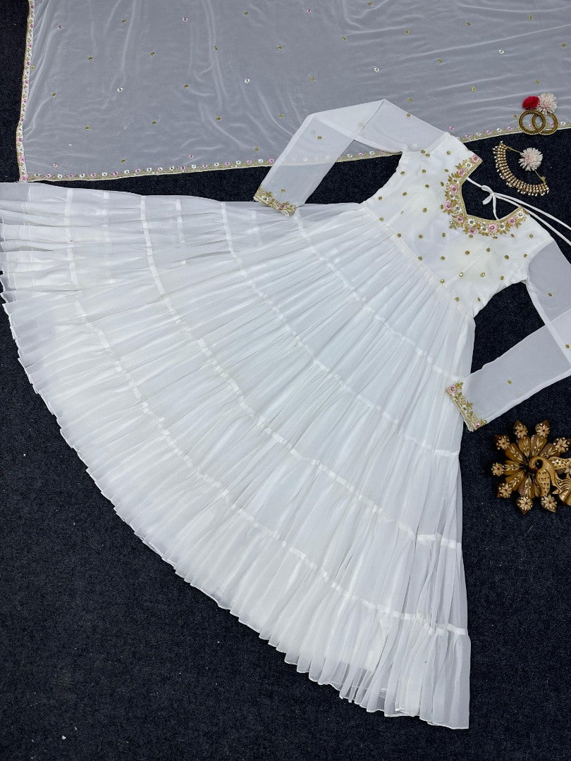 Introducing our White Georgette Thread Sequence Work Heavy Flair Party Wear Gown the epitome of elegance and style for your special occasions. This exquisite ensemble is designed to make you stand out and shine at any event.