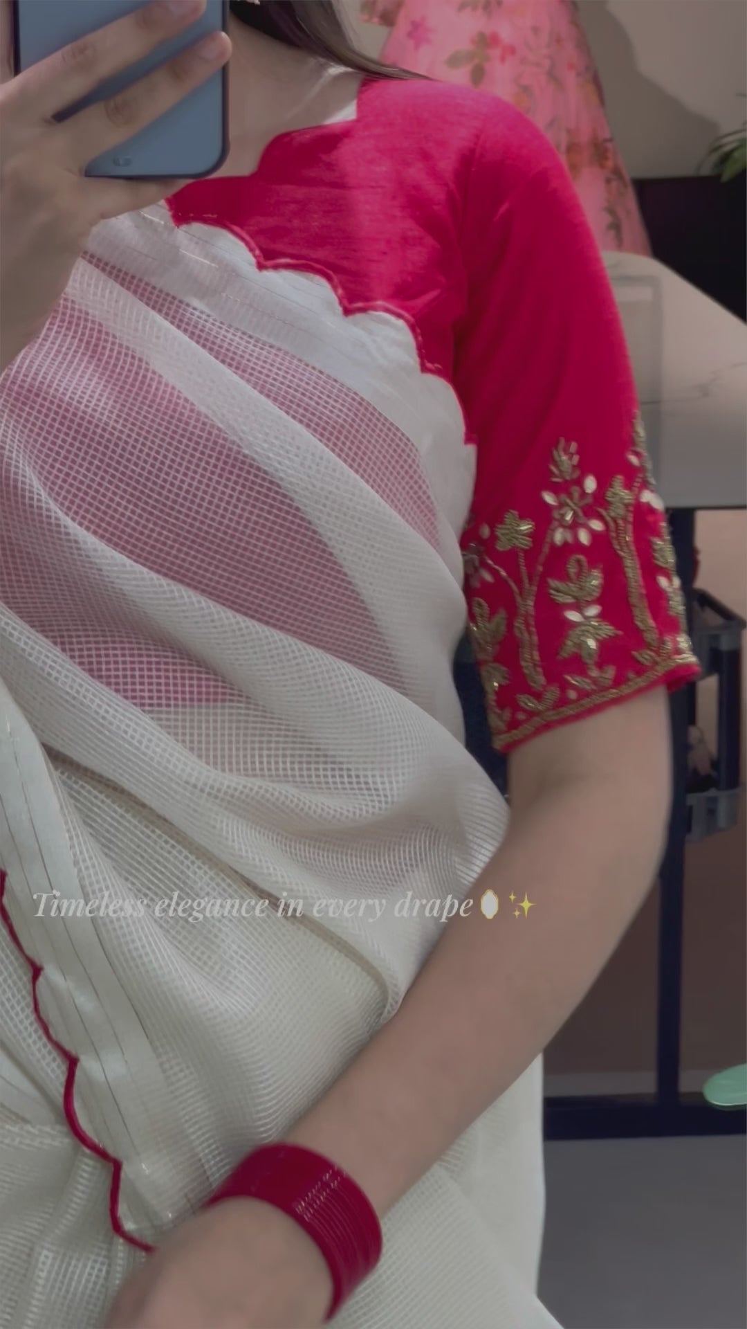 This White Manipuri Tussar Saree, adorned with intricate Arca work and a delicate scallop border, is designed to add a touch of sophistication to any occasion. The hand-worked Banglory blouse further enhances the ensemble, making it an ideal choice for those who appreciate timeless elegance. Ready to dazzle with understated charm?