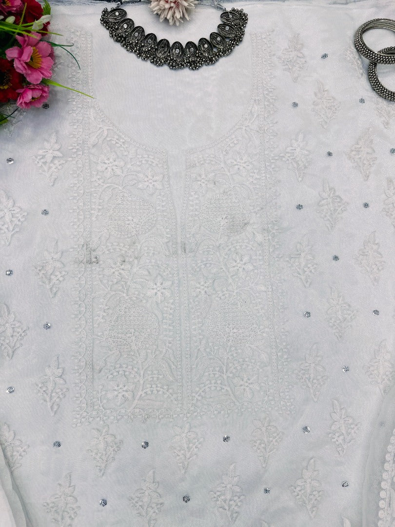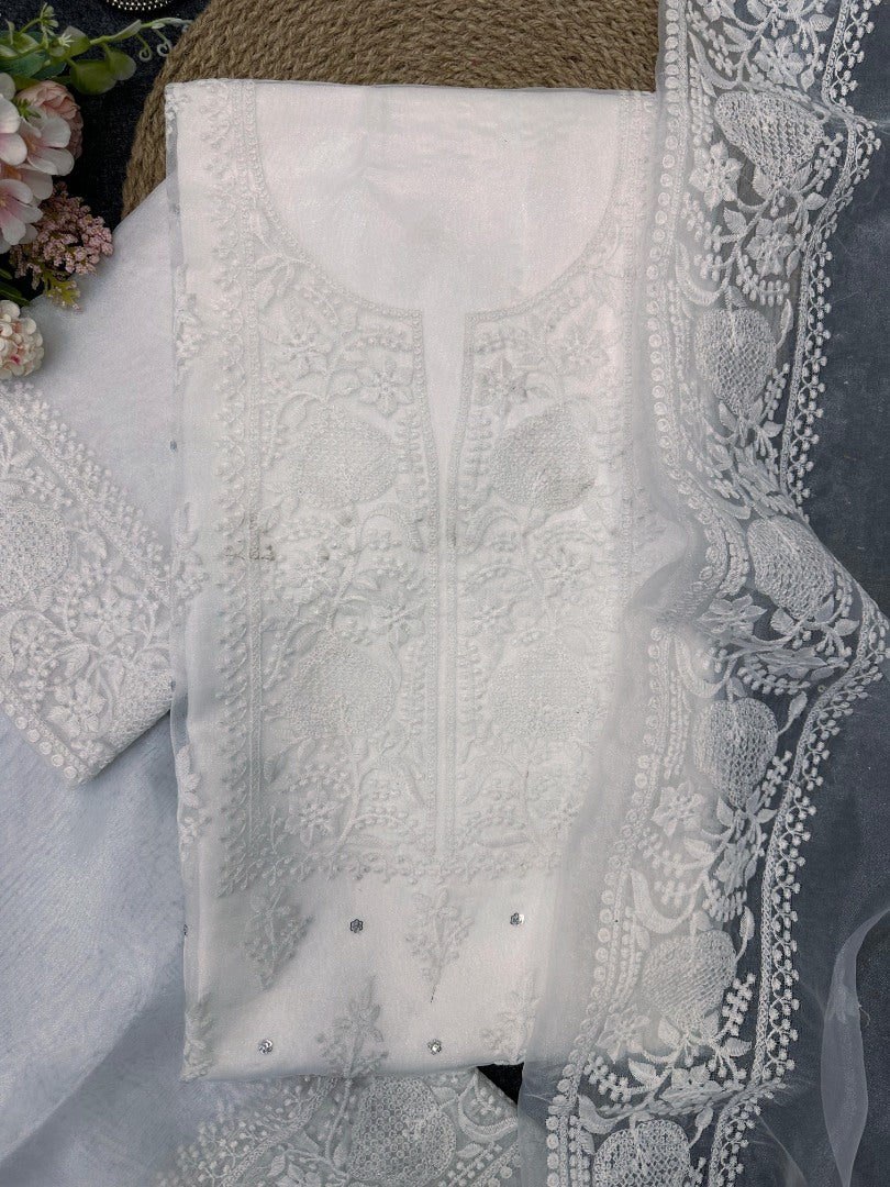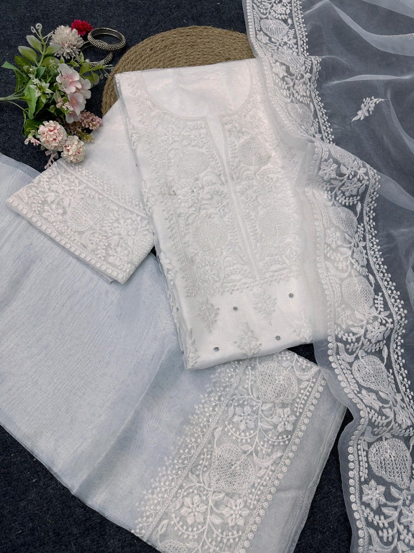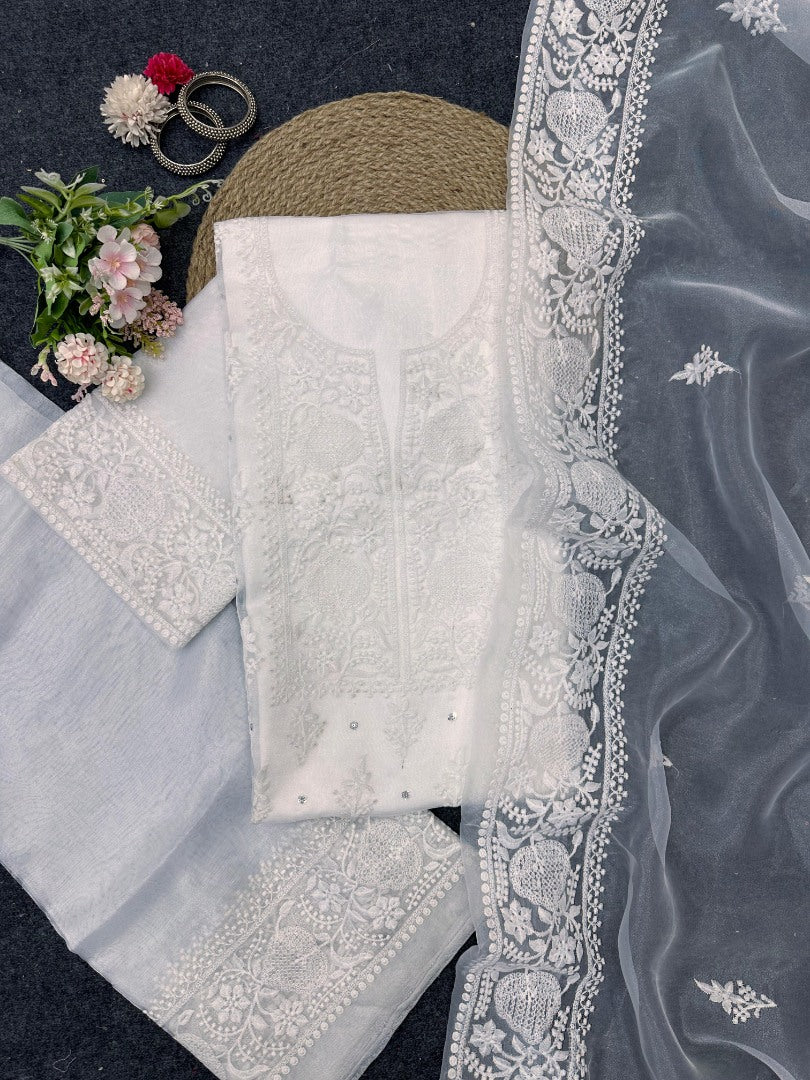 Introducing our elegant White Thread Work Stylish Unstitched Organza Salwar Suit. Crafted from luxurious organza silk with intricate thread work and sequin detailing, this suit exudes sophistication and grace. The suit comes in an unstitched design, allowing for a perfect fit up to size 50. Complete with an extra half sleeve for added flair. The accompanying pant features the same exquisite fabric and thread work, while the dupatta adds a finishing touch with its delicate thread work. Elevate your ethnic wardrobe with this timeless ensemble, perfect for any special occasion.