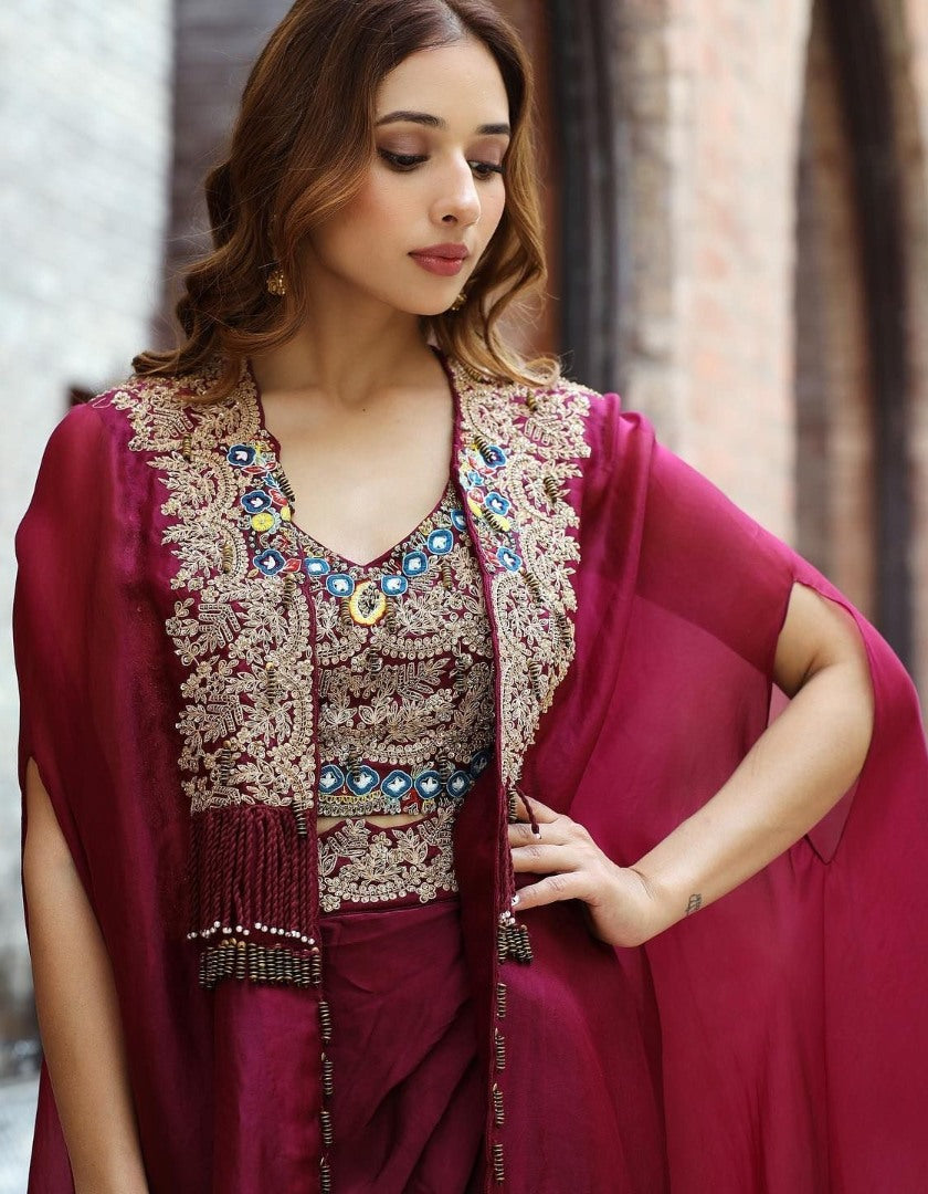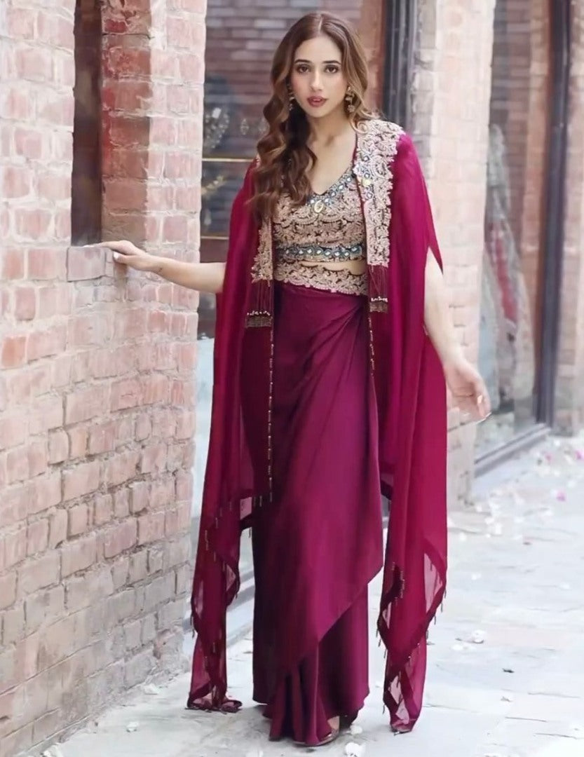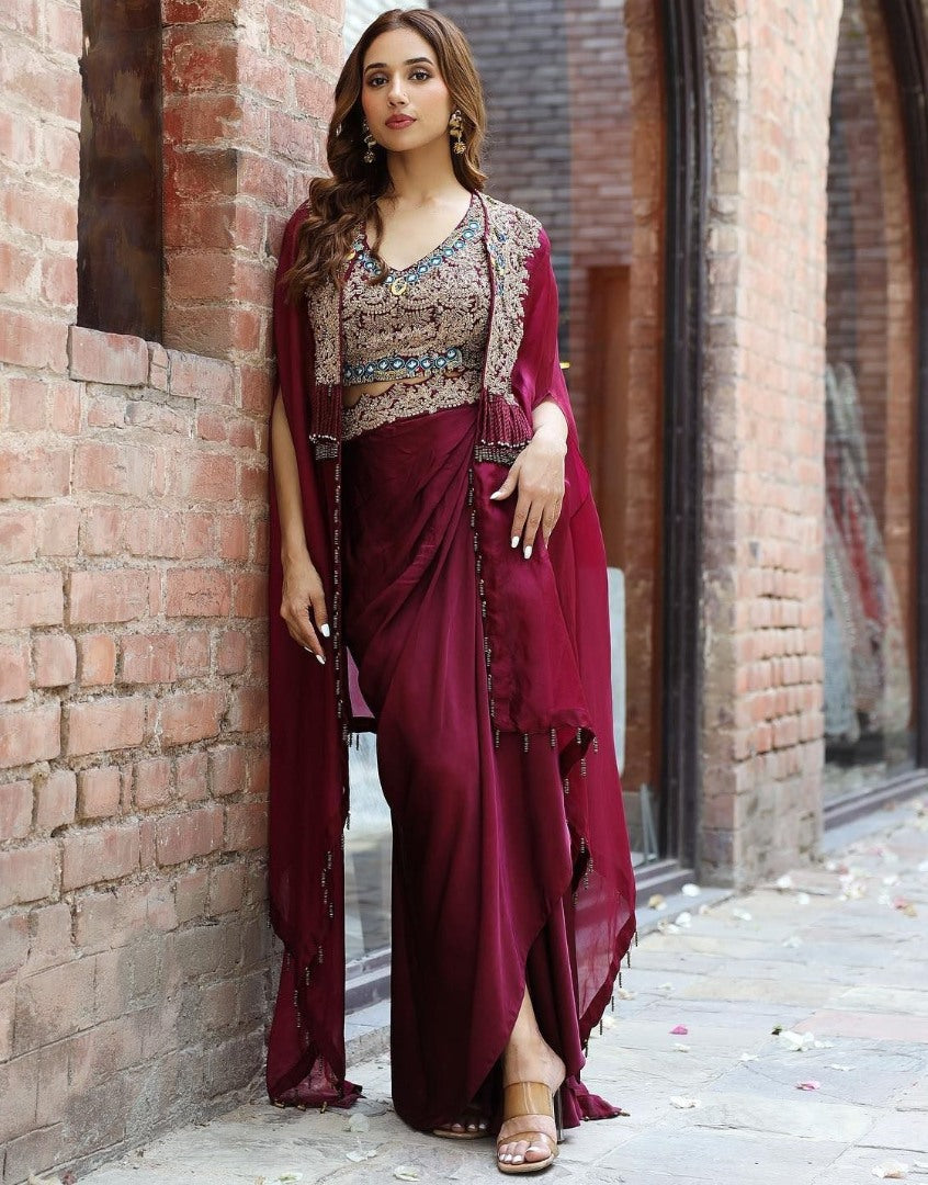 Whether you're attending a wedding, a special occasion, or simply want to make a statement at a party, this Wine Organza Thread Sequence Work Indo-Western Dhoti Suit is the perfect choice. It effortlessly combines the grace of traditional Indian wear with the flair of contemporary fashion. Stand out in the crowd with this elegant and versatile ensemble. Order yours today and step out in style!