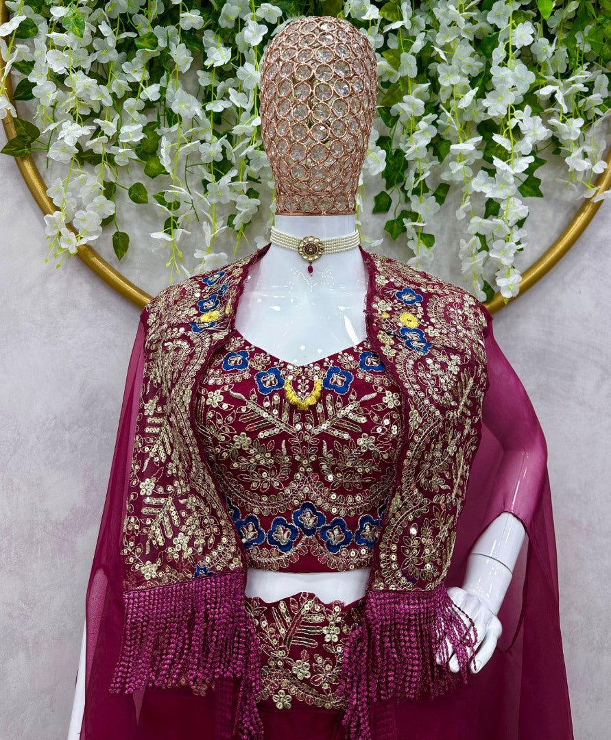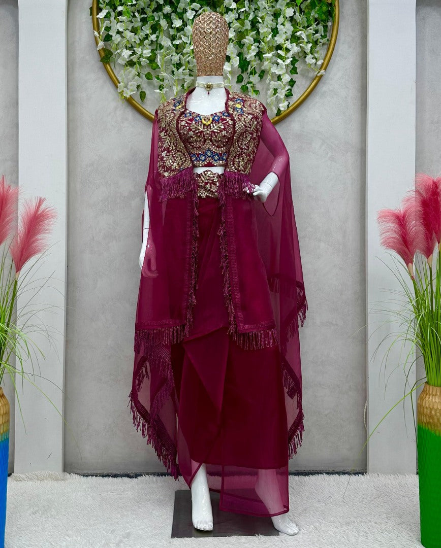 Introducing our exquisite Wine Organza Thread Sequence Work Indo-Western Dhoti Suit – a fusion of tradition and contemporary style that's perfect for every fashion-forward woman. This stunning ensemble includes a Choli, Western Dhoti, and Shrug, each designed to make you look and feel your best.