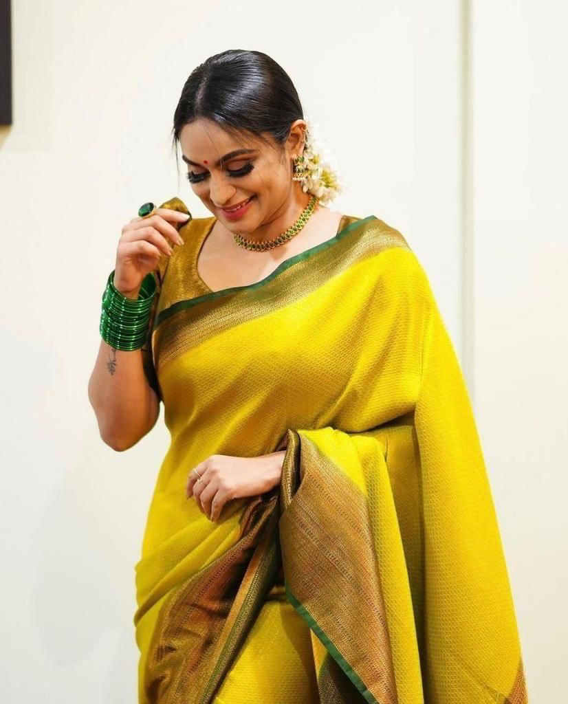 Adorn yourself elegantly with this yellow Banarasi silk jacquard work ceremonial saree, perfect for any grand occasion. Made from luxurious Banarasi soft Lichi silk, this saree features a stunning rich pallu and intricate jacquard work, exuding grace and sophistication. The exclusive jacquard border blouse with detailed work adds the perfect finishing touch, making this saree an ideal choice for weddings, ceremonies, and festive events.