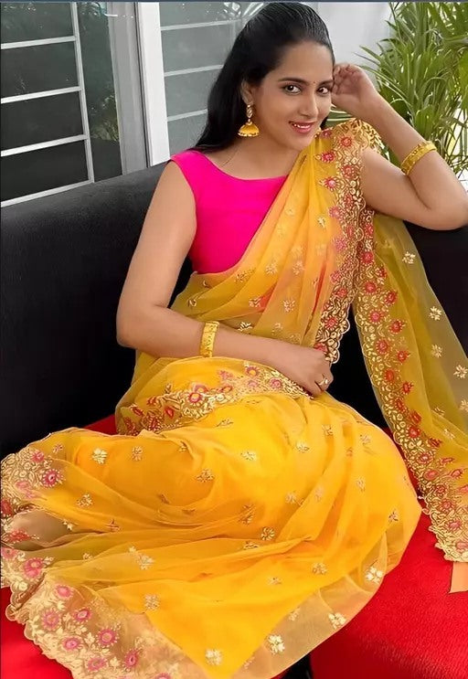 Yellow ceremonial organza saree