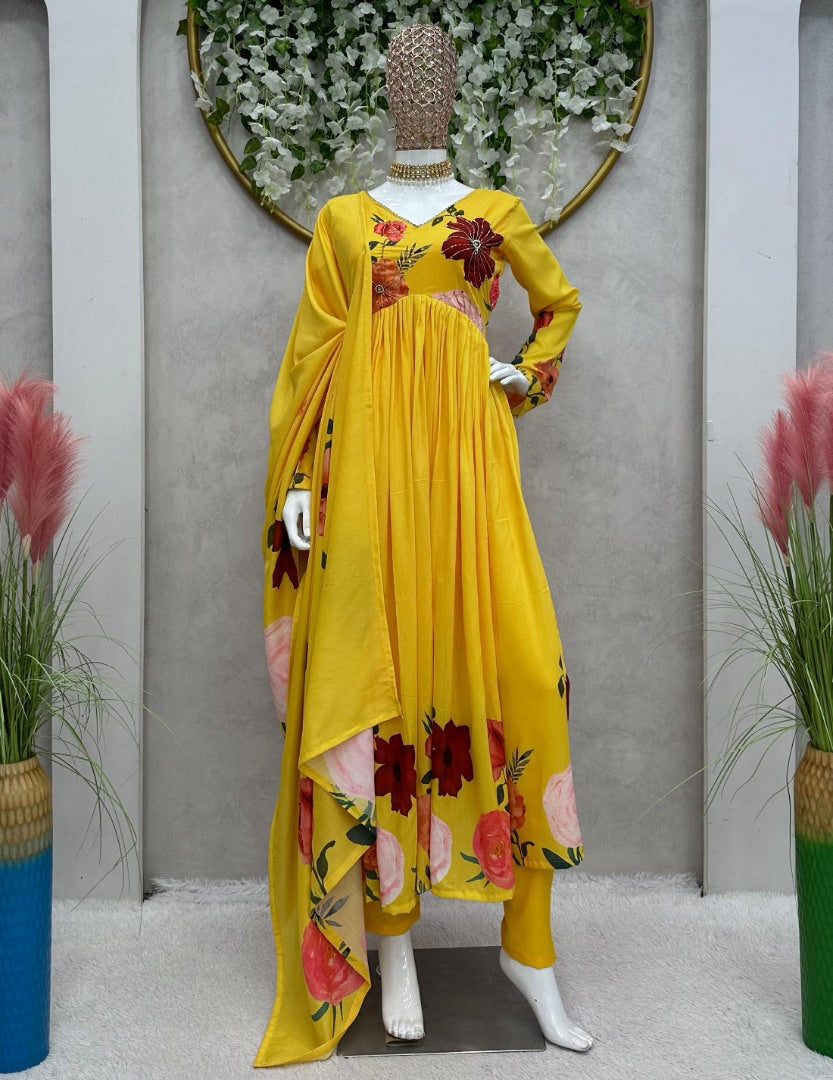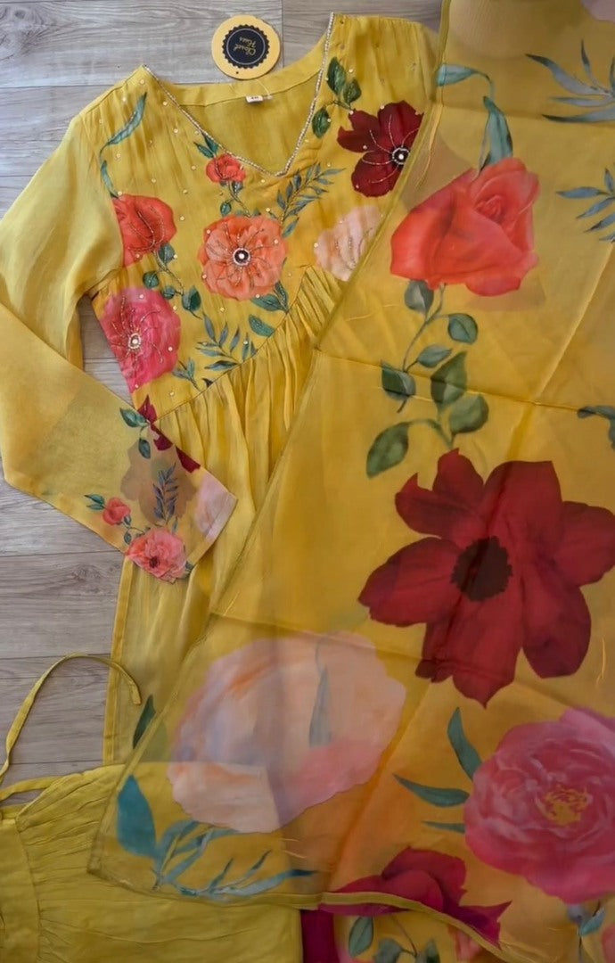 Yellow floral print alia cut suit