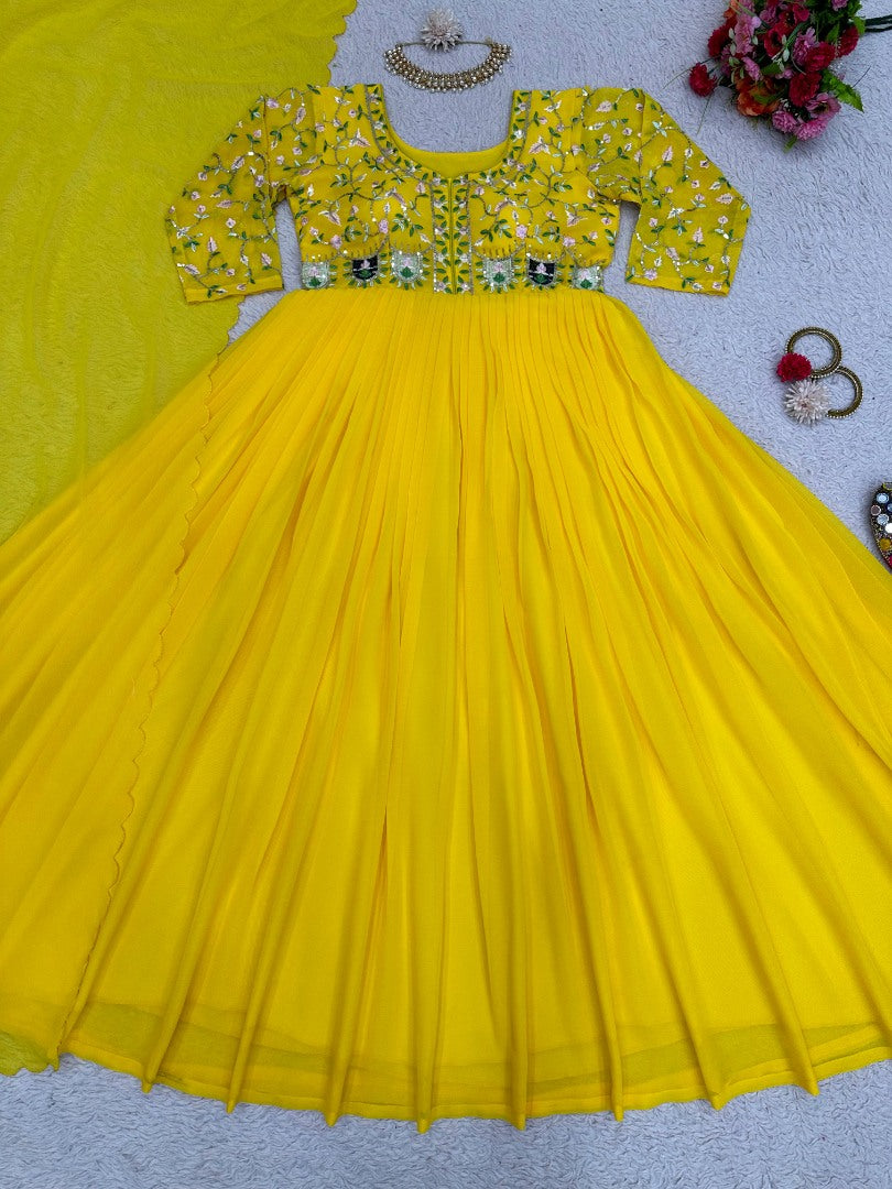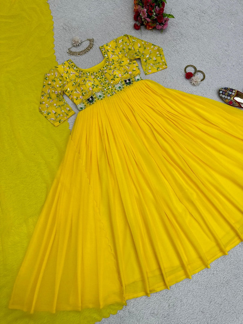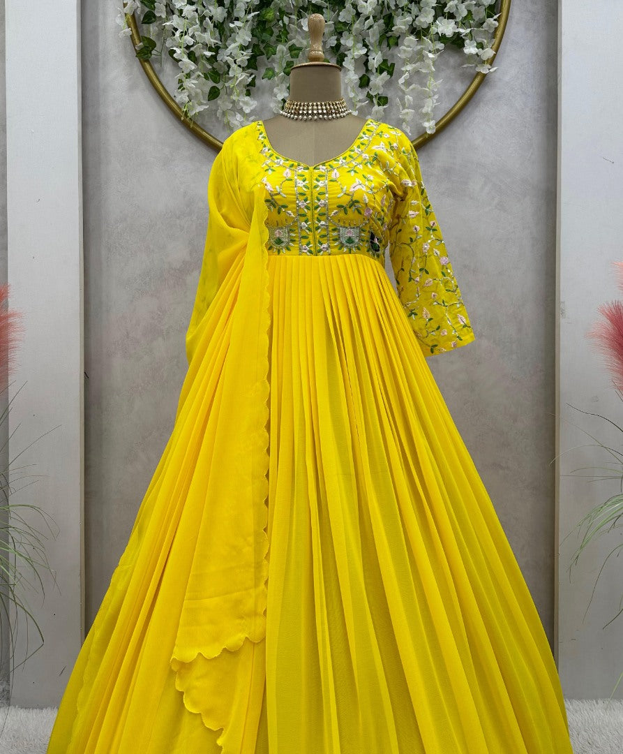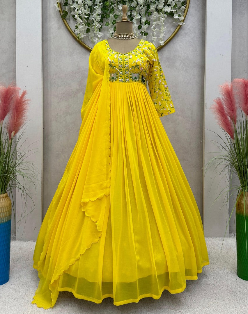 Embrace elegance with this stunning Yellow Georgette Anarkali Suit. The intricate thread, sequin work, and luxurious fabric ensure you look your best at any event. Ready to shine and impress?